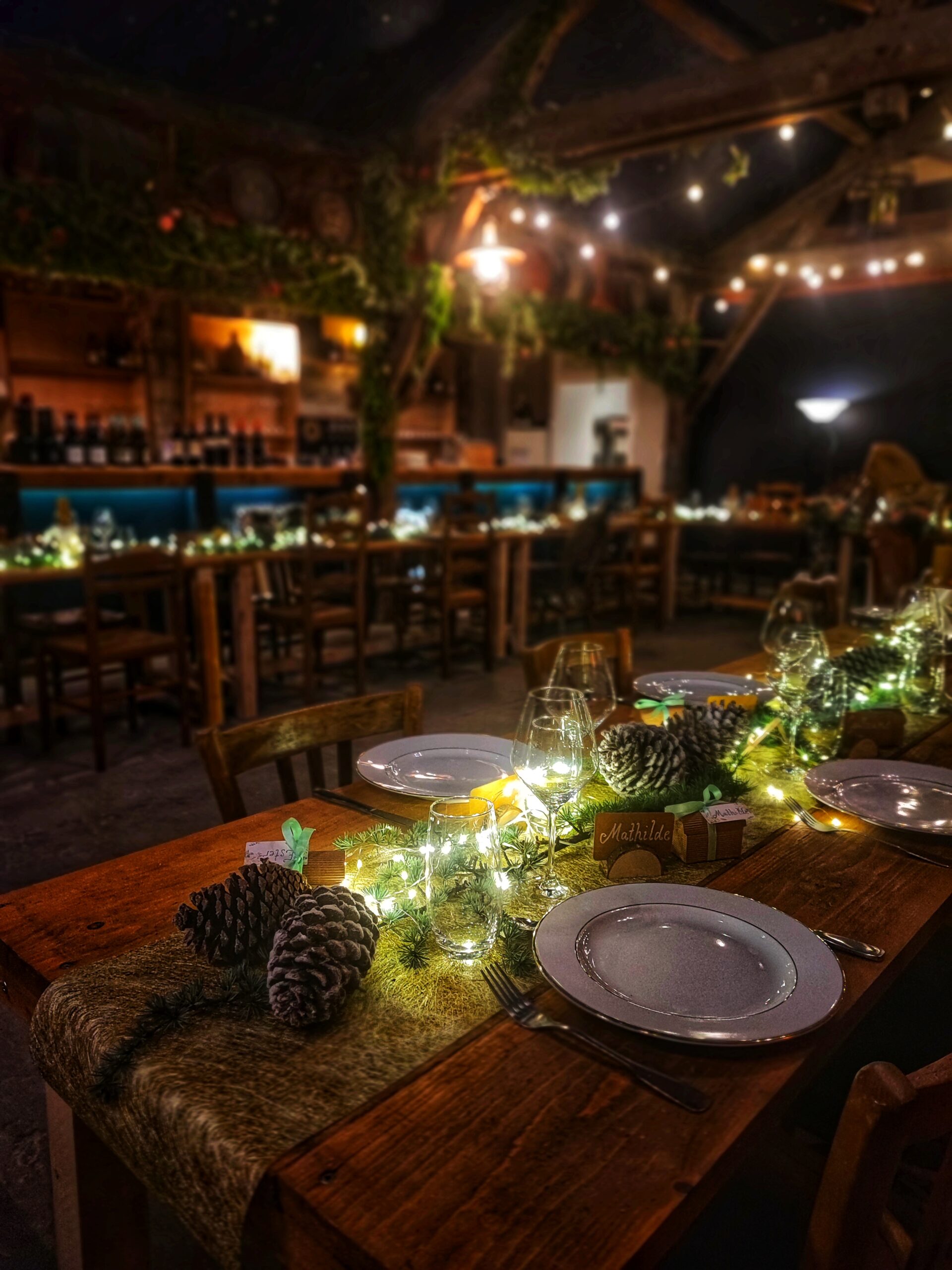Le dîner se tient sous la tonnelle dans une ambiance intime, baignée de douce lumière.